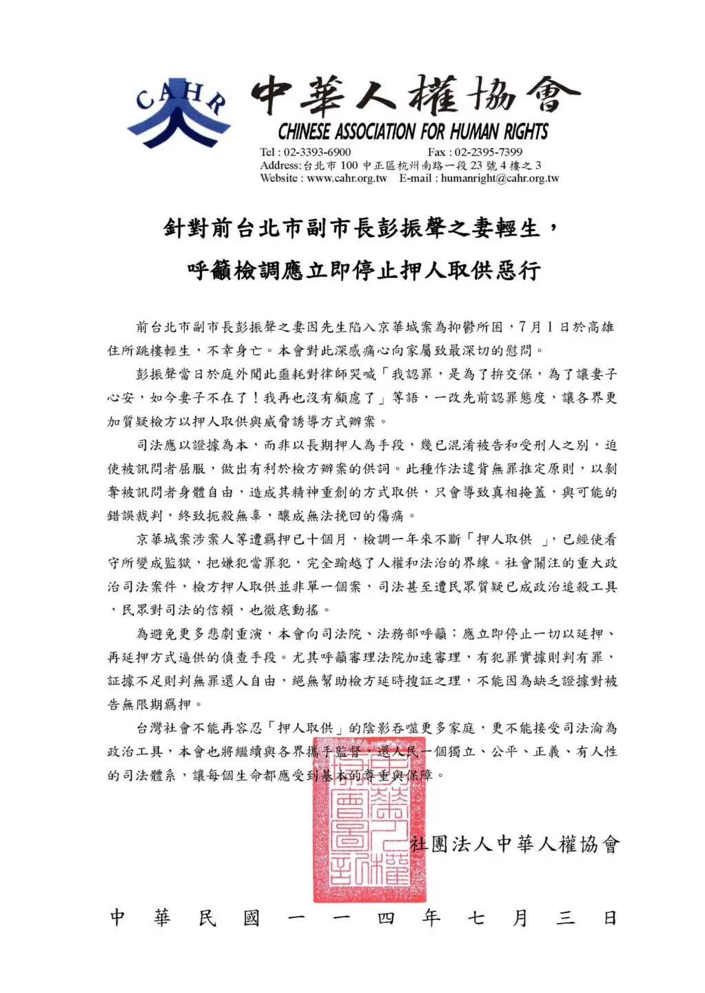 中華人權協會3日發布聲明,針對前台北市副市長彭振聲之妻輕生,呼籲檢調應立即停止押人取供惡行。